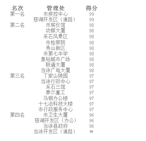 在結(jié)合公司考核小組的月檢,以及綜合業(yè)主單位的反饋意見的基礎(chǔ)上,對各管理處綜合評分,最后經(jīng)總經(jīng)理第48次辦公會議通過,現(xiàn)將有關(guān)管理處綜合考核結(jié)果通報列表如下:
