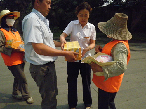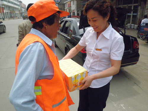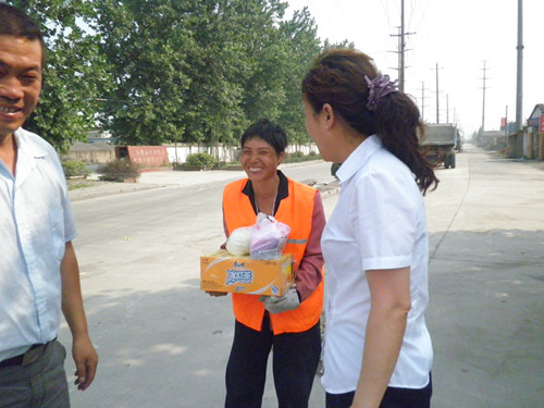 公司副總經(jīng)理朱曉軍和工會主席李平華與金太陽物業(yè)公司博望分公司道路保潔員