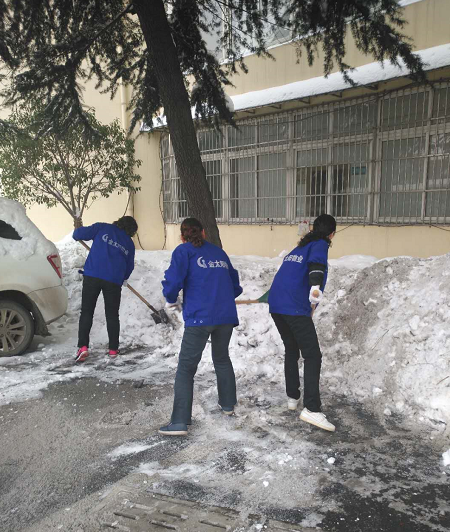 團結(jié)就是力量,干凈的道路在腳下延伸。以上是“金太陽”物業(yè)掃雪情景