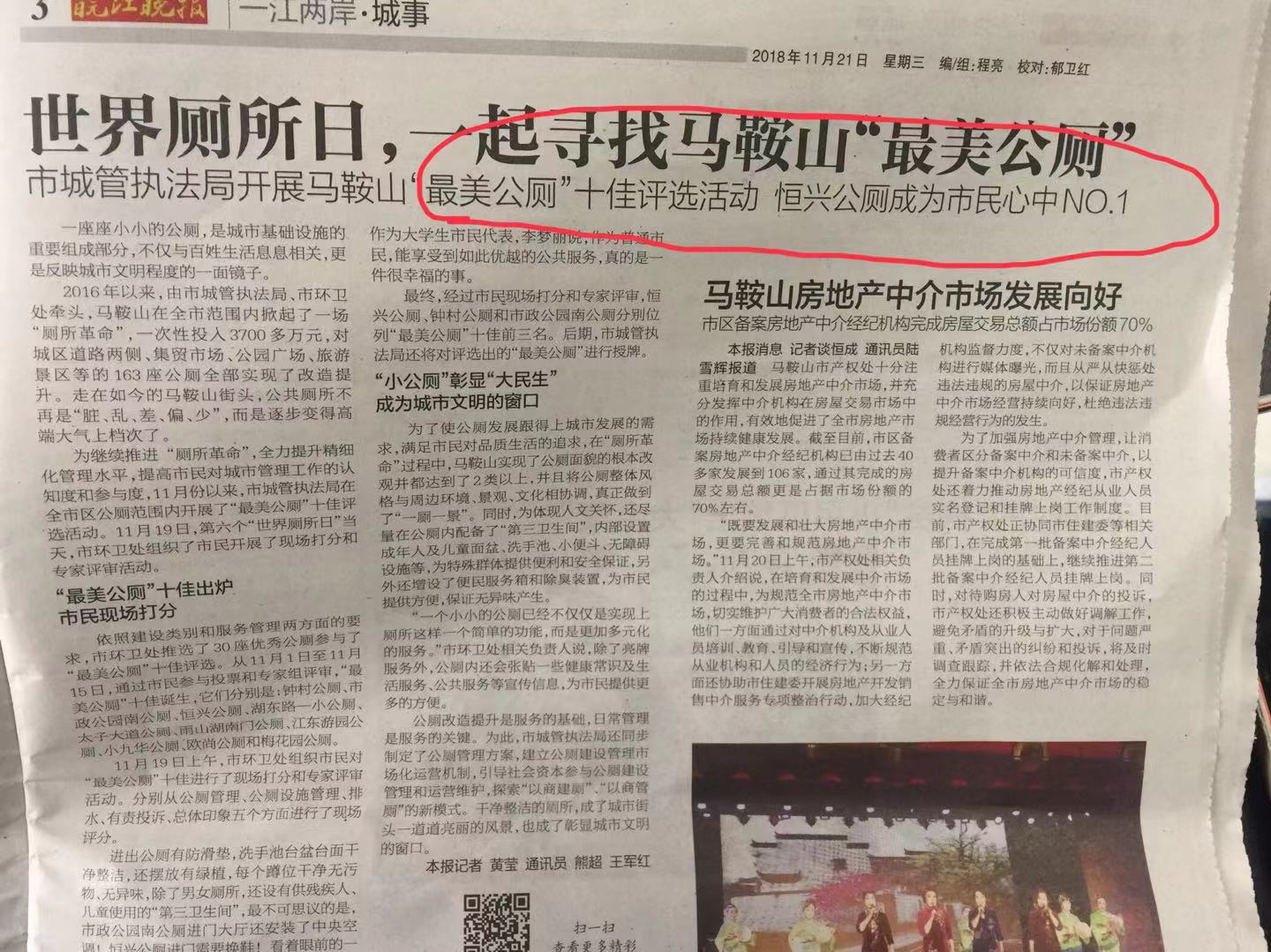 市城管執(zhí)法局開(kāi)展的馬鞍山“最美公廁”十佳評(píng)選活動(dòng)已落幕,經(jīng)綜合考核打分,我公司管理的公廁項(xiàng)目(恒興公廁)成為市民心中(NO.1),鐘村公廁、雨山湖南門(mén)公廁、湖東路一小公廁、太子大道公廁分別位列第二、第四、第五名、第六名這都離不開(kāi)管理人員的辛勤工作以及我公司各管理處和廣大市民大力支持。