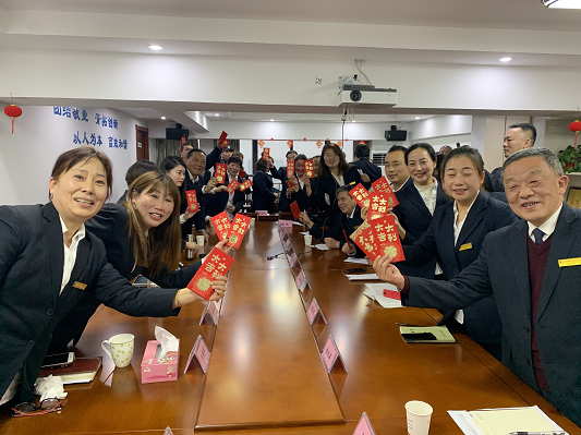 述職大會結(jié)束,“金太陽” 董事長朱曉梅女士親手為每位管理人員派發(fā)紅包,并送上新春的祝福!肯定了各述職人的工作成績,鼓勵大家今后努力改進(jìn)工作上的一些不足,述職大會后,還進(jìn)行了集體合影和聚餐。