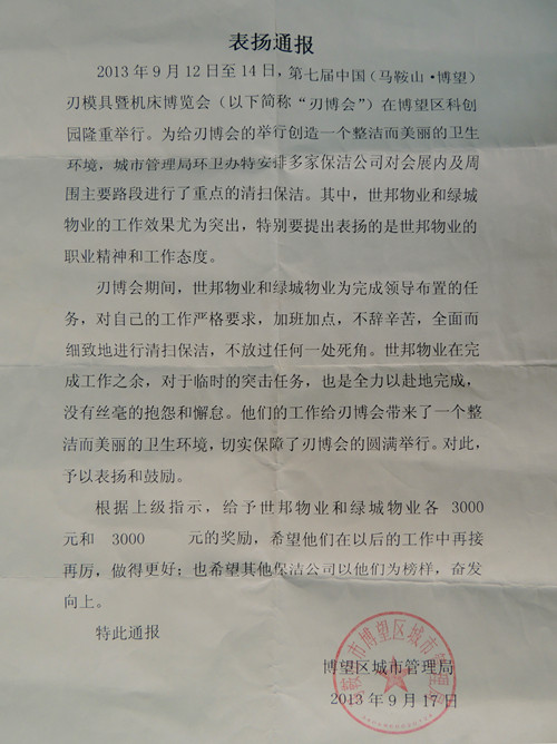 綠城勞務服務公司獲博望區(qū)城市管理局表揚通報